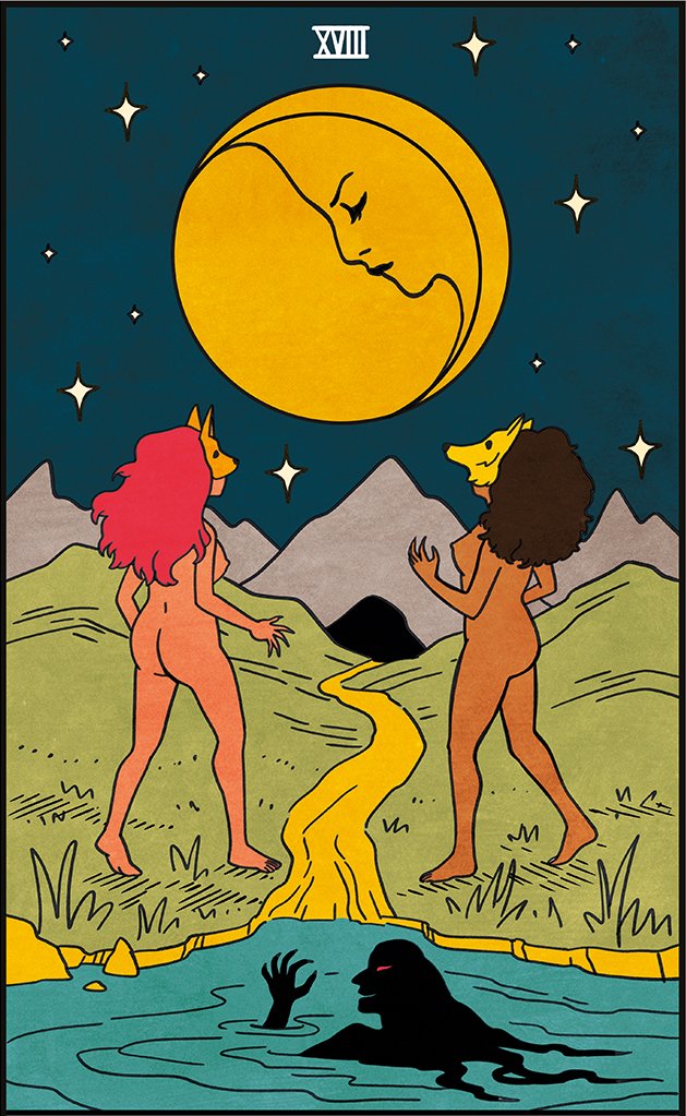 I especially love what she says here because it’s easy to see how this deck’s visual interpretation of The Moon aligns with the point Dore is making. In this sense, I could see the “confused times” being the “deity” that is being worshipped by the two figures in the card. They are basking in their own confusion, and they are doing so through a ritual that is absolutely “calling on parts of themselves that they can’t access otherwise”. The part of themselves that they can’t access otherwise is the ink lady from the river — She, who was born from their intuition and who they share those animalistic, claw-shaped hands with.